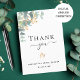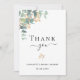 Um cartões de agradecimentos para um Chá de panela. Um fundo branco chico decorado com verde de eucalipto. Na frente, um grande script de cor preta, escrito à mão, e o texto: Obrigado, seu e uma data. Voltar: Personalize e adicione seu nome e nota de agradecimento.