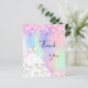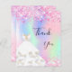 Um cartões de agradecimentos de aniversário feminino e elegante. Uma cor de fundo holográfica rosa, roxo e verde de menta. Com um confete rosa e um vestido branco. Na frente, o texto escrito em letras grandes e o texto: Obrigado. Voltar: Personalize e adicione seu nome e nota de agradecimento. O nome é escrito com um moderno estilo escrito à mão.