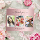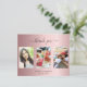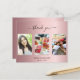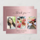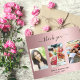 Um aniversário de 21 anos glamouroso (ou idade doce) Cartões de agradecimentos personalizado com sua própria foto. Adicione 3 das suas fotos de aniversário, tamanho vertical, uma data, nome e a nota de agradecimento. Um fundo metálico rosado e roxo feminino, de aparência falsa, com texto preto. O texto: Obrigado na frente e seus nomes no verso são escritos com um roteiro à mão com na moda com hastes.