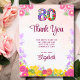 Obrigado de aniversário de 80 Floral, seu chic de 80 florais. Mostre sua gratidão em estilo com este elegante cartões de agradecimentos de aniversário com sotaques florais vibrantes e uma mensagem sincera. A frente do cartão exibe um "80" grande em design floral colorido e as palavras "Obrigado" em um roteiro em negrito, seguidas de uma mensagem personalizável. O verso apresenta uma emocionante nota de apreço por celebrar um marco de 80 anos maravilhosos cheios de amor, riso e memórias. Este cartão é a forma perfeita de expressar suas obrigados por assistir ao seu dia especial e por quaisquer presentes generosos recebidos. Personalize facilmente este cartões de agradecimentos para refletir os seus próprios sentimentos exclusivos. Aproveite!