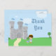 A festa de aniversário deste rapaz fofo Obrigado A carta de posto tem um tema do Príncipe Real Encantador! Há um castelo de cinza no fundo com três bandeiras azuis voando no topo. No fundo, há um príncipe cabeludo vestindo uma coroa dourada com uma jaqueta azul. No chão próximo ao príncipe, há uma rosa vermelha e um escudo. Do lado direito, obrigado. No verso, você pode personalizar o obrigado da mensagem ou deixá-lo vazio para escrever em sua mensagem em casa. Gráficos por Designs da Zenware em MyGrafico.com