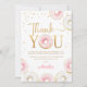 Rosquinhas brancas cor-de-rosa doces de um cartões de agradecimentos de primeiro aniversario. Design de tendências cegas com rosquinhas cor-de-água rosa e branca. Apresenta a fonte do script de tipografia 1. Você pode escolher convites impressos e/ou fazer o download instantâneo do modelo digital. Perfeito para uma festa de 1ª mulher na moda.