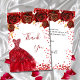 Um cartões de agradecimentos de aniversário feminino e elegante. Um fundo branco, com brilho vermelho, faíscas, rosas vermelhas e um vestido vermelho. À frente, um grande texto escrito à mão e o texto: Obrigado. Voltar: Personalize e adicione seu nome e nota de agradecimento. O nome é escrito com um moderno estilo escrito à mão.