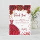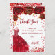 Um cartões de agradecimentos de aniversário feminino e elegante. Um fundo branco, com brilho vermelho, faíscas, rosas vermelhas e um vestido vermelho. À frente, um grande texto escrito à mão e o texto: Obrigado.