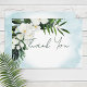 Este design de cartões de agradecimentos de casamento apresenta um belo, esmagador verde-trópico e florais brancos num fundo azul aqua de cor azul-aqua de Caribe mole. Perfeito para o casamento de destino ou praia. Use a mensagem incluída ou altere-a para adicionar a sua própria mensagem. Criado pela imprensa simplesmente de farmácia.