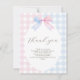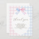 Mostre apreço aos seus hóspedes com este cartões de agradecimentos "Azul ou Rosa?" que revela o gênero, com um design de arco gingham e estilo chá de fraldas elegante.