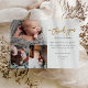 Este Cartões de agradecimentos Photo Collage Baby Script 3 apresenta um obrigado de caligrafia manuscrito em ouro moderno, e uma mensagem pessoal na frente. Clique no botão personalizar para personalizar este design com suas fotos e detalhes.