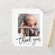 Este bebê de 3 fotos, obrigado, apresenta um obrigado de caligrafia moderno que você tem em branco com uma foto grande do cliente. O interior inclui um obrigado genérico que você pode personalizar para cada convidado ou removê-lo completamente se preferir entregar seu obrigado à direita. Clique em editar para personalizar.