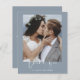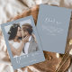 Boas-vindas do Orçamento Azul Obrigado Cartões que têm uma foto na frente e atrás. Os cartões de agradecimento contêm uma tipografia cursiva moderna, escrita com letra de mão, que é elegante, simples e moderna para usar após a celebração do dia do casamento.