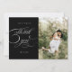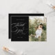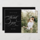 obrigado de caligrafia elegante, cartão com fotos com fontes de script destacadas em diferentes planos de cores com sua própria foto e uma nota gentil no verso
