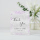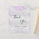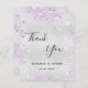 Um cartões de agradecimentos de casamento. Uma cor falsa de fundo com aspecto prateado. Com Lavanda, poeira violeta falso. À frente, um grande texto escrito à mão e o texto: Obrigado, seus nomes e uma data. Voltar: personalize e adicione seu aviso de agradecimento e nomes.