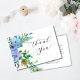 Elegante, porém moderno, com a natureza inspirada em elementos boho e um estilo romântico suave. A frente do cartão apresenta um arranjo floral luxuoso com uma caligrafia moderna "Obrigado". A parte traseira do cartão apresenta a sua mensagem personalizada. Um belo cartões de agradecimentos perfeito para casamentos elegantes, ruidosos ou rústicos.