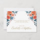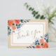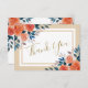 Cartões de agradecimentos de casamento elegante e moderno, com design de cor d'água floral de rosas de cor laranja e folhagem azul num creme e fundo branco.