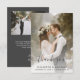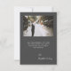 Cartões de agradecimentos moderno de casamento com uma foto vertical personalizada na frente e uma foto horizontal no verso. As palavras "Obrigado" aparecem na escrita manual de cinzas de carvão com traços decorativos no início e no fim. Adicione seus nomes e a data e local do casamento abaixo na fonte sans serif. Personalize o lado inverso com uma mensagem de sua preferência em sans serif branco em um plano de fundo de cinza e adicione sua linha de assinatura em letra decorativa de escrita manual. Substitua facilmente as imagens de amostra pelas suas próprias fotos de casamento. Uma tela de gradiente branco ajuda a garantir o texto na parte frontal das pop da placa.