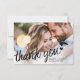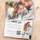 Obrigado seus convidados de casamento com este cartões de agradecimentos elegante e elegante. A frente desta moda e cartão moderno é personalizável com uma de suas fotos de casamento favoritas e apresenta a frase "Obrigado" em uma fonte de caligrafia preta decorada com um pequeno coração, seus nomes e sua data de casamento sobre uma camada transparente de gradiente branco. A parte de trás do cartão é facilmente personalizável com seu obrigado pessoal, sua mensagem, uma segunda foto e um Código QR personalizado que levará ao seu site de casamento ou galeria de fotos online.