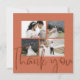 Um simples e elegante cartões de agradecimentos fotográfico de dois lados com fundo de terracota e quatro fotografias a preto e branco serão amadas por todos os seus convidados de casamento. Basta adicionar suas melhores fotos de casamento e substituir a mensagem para seus convidados no lado traseiro do cartão. Você também pode mudar a cor da inscrição "Obrigado".