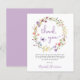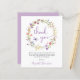 Um cartões de agradecimentos de chá elegante e acessível para bebês, com "obrigado você" em um roteiro roxo na moda, aquarelas de uma coroa de flores roxas, rosa, pêssego e amarelas, e uma borboleta roxa. Personalize seu obrigado que você envia e adicione seu nome em um script semelhante a assinatura ou deixe o vazio para uma nota manuscrita.