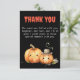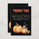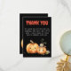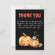O cartão de chá de fraldas "Obrigado por Vir" do tema do Dia das Bruxas apresenta um esquema de cores preto e laranja cativante, capturando a essência da estação assustadora. Na parte inferior da carta, há uma ilustração encantadora de Cute Pumpkins dando nod à magia reprodutora da celebração do chá de fraldas.
