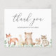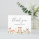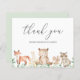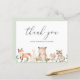 Cartões de agradecimentos de chá de fraldas com orçamento bonito, com uma cena pintada de aquarela com animais da floresta em uma floresta e "obrigado você" em uma letra de escrita caprichosa junto com seu nome. O verso tem sua mensagem personalizada, o que torna fácil e rápido enviar suas cartas de agradecimento. Este cartões de agradecimentos rústico de chá de fraldas é neutro em relação ao gênero, então é excelente se você está tendo um menino ou uma garota.