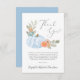 Um doce cartões de agradecimentos para a festa do seu chá de fraldas com "Obrigado" num roteiro de cinza com um inchaço cardíaco, e uma aquarela de uma abóbora azul pastel, florais laranja e verde. Personalize sua mensagem de obrigado em uma simples tipografia de cinza e adicione seus nomes em um script de cinza semelhante a assinatura.