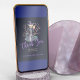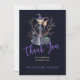 Chic elegante Halloween escuro, meia-noite azul e cartões de agradecimentos de tipografia de aquarela roxa apresentando uma bruxa em um vestido de carvão de cinza e chapéu com vassoura e pá. Adequado para o chá de panela malvado de bruxas do Halloween. Download digital disponível.