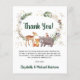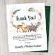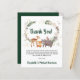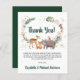 Cartões de agradecimentos de chá de fraldas favorável ao orçamento. Esta design russa de inverno apresenta ilustrações em aquarela de animais de floresta, florais, estrelas verdes e douradas e flocos de neve. "Obrigado" está escrito em um roteiro verde de caçador negro. Adicione o seu obrigado personalizado ou deixe o vazio para uma nota manuscrita.