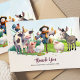 Diga obrigado em estilo inspirado na fazenda com este adorável cartões de agradecimentos de chá de fraldas. Apresentando ilustrações bonitas de animais celeiros como porcos, vacas, ovelhas, burros, gansos e galos, juntamente com sentimentos divertidos de Oink, Baa, Moo e Cock-a-Doodle Doo. Personalize-o facilmente com os detalhes da sua parte e torne-o exclusivo para o dia especial usando o botão "personalizá-lo" para as opções de formatação e posicionamento de texto. Além disso, este cartões de agradecimentos é perfeito para coordenar com outros suprimentos de fazenda para um olhar coeso e sentir a celebração do seu chá de fraldas. Mostre seu apreço aos seus convidados de uma forma divertida e memorável com este cartões de agradecimentos de animais fazendas charmoso.