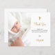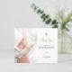 Um cartões de agradecimentos de batismo minimalista de ouro branco e falso. Personalize e adicione sua foto da criança, obrigado nota e nome. Sexo neutro. Voltar: ícones das mídias sociais, seu próprio código qr para sua conta ou site do Instagram para que seus convidados possam ver mais fotos. Este cartão também está disponível em nossa loja sem ícones nas mídias sociais.