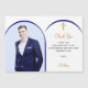 Um Cartões de agradecimentos de fotos magnéticas de confirmação. Adicionar uma foto de tamanho vertical. Um quadro fotográfico em forma de arco azul. Personalize e adicione um nome e detalhes.
