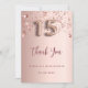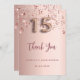 Um cartões de agradecimentos para uma Quinceañera. Uma cor de fundo rosa dourada. Com rosa dourado pingando estrelas brilhantes. Na frente: número 15 escrito com uma fonte no estilo do balão, um grande script com letra rosa dourada escura e o texto: Obrigado, seu texto, título e uma data. Voltar: Personalize e adicione seu nome e nota de agradecimento.