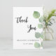 Um fundo branco chico decorado com verde de eucalipto. Na frente, um grande script de cor preta, escrito à mão, e o texto: Obrigado, seu e uma data. Voltar: Personalize e adicione seu nome e nota de agradecimento.