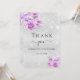 Um cartões de agradecimentos para um aniversário de 50 anos (ou qualquer idade). Uma cor falsa de fundo com aspecto prateado. Decorado com flores cor-de-rosa, violetas e poeira brilhante fraca. À frente, um grande texto escrito à mão e o texto: Obrigado, seu texto, título e uma data. Voltar: personalize e adicione seu nome e nota de agradecimento.