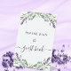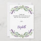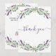 Um cartões de agradecimentos de aniversário feminino e elegante. Um fundo branco, decorado com lavanda, flores violetas e verde de eucalipto. Na frente, o texto escrito em letras grandes e o texto: Obrigado. Voltar: Personalize e adicione seu nome e nota de agradecimento. O nome é escrito com um moderno estilo escrito à mão.
