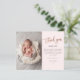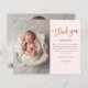 Esta foto moderna, graças a você, apresenta rosa gold, um obrigado de script manuscrito, mensagem pessoal e uma foto vertical na frente. O verso inclui uma segunda foto de bebê que é uma foto horizontal de cheio.