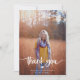 Sobreposição de fotos da tipografia branca-chic, cartões de agradecimentos de graduação. Recursos, foto de sangria de cheio na parte frontal, sotaque de boné de formatura, quadro de foto redondo na parte traseira com cor azul de marinho.