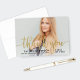 Na moda e cartões de agradecimentos de graduação dobrado elegante apresentam uma foto de mais velho com a cobertura de script de folha de ouro falso "obrigado você". Personalize o texto personalizado moderno com seu nome de formando, escola e ano de aula. Um obrigado personalizado que você envia e/ou fotografar pode ser adicionado ao dentro da placa.