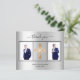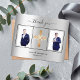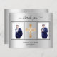 Adicione 3 das suas fotos de aniversário, tamanho vertical, uma data, nome e a nota de agradecimento. Um fundo azul clássico do marinho com texto e quadro brancos. O texto: Obrigado na parte frontal e seu nome no verso é escrito com um roteiro à mão com na moda com baloiços.