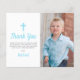 Obrigado a sua família e amigos por estarem no primeiro aniversário e batismo do seu bebê com uma foto do seu filho. O design azul apresenta bolinhas brancas em um plano de fundo de aquarela azul na parte traseira da placa. Todo o texto pode ser personalizado, incluindo o nome do seu filho e a mensagem.