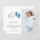 O Cartões de agradecimentos de Chá de fraldas deste garoto está decorado com tipografia elegante de script e pés de bebê brilhante azul. Facilmente personalizável com sua mensagem e foto.