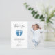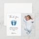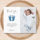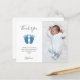 O Cartões de agradecimentos de Chá de fraldas deste garoto está decorado com tipografia elegante de script e pés de bebê brilhante azul. Facilmente personalizável com sua mensagem e foto.