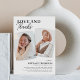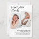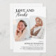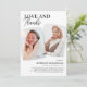 Elegante cartões de agradecimentos fúnebre memorial com um simples fundo branco, duas fotos da pessoa que faleceu, uma mensagem personalizada de apreciação, seu nome e datas de nascimento/morte.