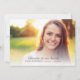 Um belo cartões de agradecimentos funerário para expressar a gratidão de sua família. A frente apresenta "Obrigado" em uma fonte elegante de caligrafia de script e sua mensagem personalizada. A parte de trás apresenta uma fotografia e um texto personalizado. Altere facilmente a cor da borda para se adequar ao seu estilo. Elegante e clássico - este modelo facilita o obrigado aos seus convidados funerários pelas suas palavras amáveis, cartas e apoio. Você pode excluir a mensagem digitada e deixar o vazio de espaço para uma mensagem manuscrita. Precisa disso em breve? Compre um download Digital do nosso cartões de agradecimentos e envie-o para impressão na sua impressora local. Muitas lojas oferecem impressão e coleta no mesmo dia. O download digital também permite enviar sua nota eletronicamente.