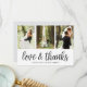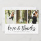 Um moderno cartões de agradecimentos de casamento projetado para acomodar três das suas fotos favoritas de casamento alinhadas lado a lado. "Amor e obrigados" aparece por baixo das suas fotos, em letras de estilo manuscrito preto, com os seus nomes por baixo. Adicione uma mensagem opcional à parte de trás com padrão sutil usando o campo fornecido ou exclua o texto de amostra para adicionar sua própria mensagem manuscrita de obrigados.