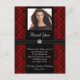 Cartões de agradecimentos de Graduação Personalizável com uma Foto Imagem do formando, seja uma imagem de escola ou de classe mais velho. Obrigado a todos os presentes e presentes na sua cerimônia ou pós-comemoração. Fundo vermelho escuro com cor damasco preta, fita preta e joia falsa de rocha de diamante no centro.