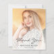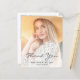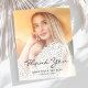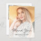 Cartões de agradecimentos de graduação moderno com uma foto vertical personalizada na frente e uma foto horizontal no verso. As palavras "Obrigado" aparecem na escrita de cinzas de carvão negro, com o seu nome e ano de graduação em sans serif. Personalize o lado inverso com uma mensagem de sua escolha em cinzas sans serif e adicione sua linha de assinatura em letra decorativa de escrita manual. Substitua facilmente as imagens de exemplo por suas próprias fotos. Uma tela de gradiente branco ajuda a garantir o texto na parte frontal das pop da placa. Ideal para segundo grau ou formandos.