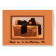 As cores cobre, laranja e marrom nesta design de cartas, fazem um cartões de agradecimentos elegante para aquele maravilhoso presente que você recebeu. O cartão tem um presente embrulhado com papel listrado de cobre, um arco marrom com pequenos ornamentos e uma borda laranja média rodeia o presente.