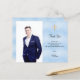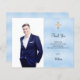 Um cartões de agradecimentos de confirmação moderno e elegante. Um fundo metálico azul-claro, com aspecto fino, decorado com uma cruz de ouro. Personalize e adicione sua foto, obrigado nota e nome.