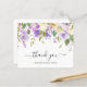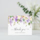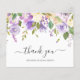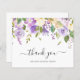 Cartões de agradecimentos de compaixão floral roxo com uma borda superior de flores pintadas a aquarelas em tons de violeta pastel, lavanda, lilás e marfim. Abaixo está "obrigado você" na escrita junto com o nome da família do falecido. Use a modelo para adicionar sua mensagem personalizada. Uma escolha elegante para agradecer aos convidados do funeral de alguém apaixonado.