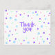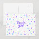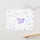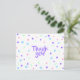 Um cartões de agradecimentos brincalhão com a tipografia moderna, escrita à mão, está no centro de um padrão confete estilo Memphis de triângulos cor-de-rosa, círculos roxos, espirais azuis, rabiscos ondulados e minúsculos traços em branco nítido. A paleta pastel brilhante e o modo geométrico criam um olhar alegre e otimista adequado a qualquer ocasião. O inverso é vazio de escrever manualmente uma nota personalizada ou mensagem de apreciação.