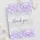 Um cartões de agradecimentos de aniversário feminino e elegante. Uma cor de fundo metálica de aparência fina prateada. Com poeira brilhante violeta e roxa. Na frente, o texto escrito em letras grandes e o texto: Obrigado. Voltar: Personalize e adicione seu nome e nota de agradecimento. O nome é escrito com um moderno estilo escrito à mão com traços.